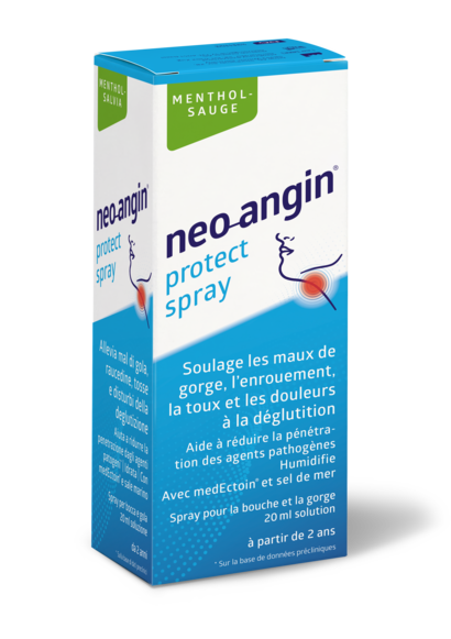 Lo spray neo-angin protect con medEctoin® e sale marino idrata le mucose secche e irritate della bocca e della gola, allevia il mal di gola e disturbi quali raucedine, stimolo alla tosse, tosse secca e difficoltà di deglutizione, favorendo la rigenerazione.